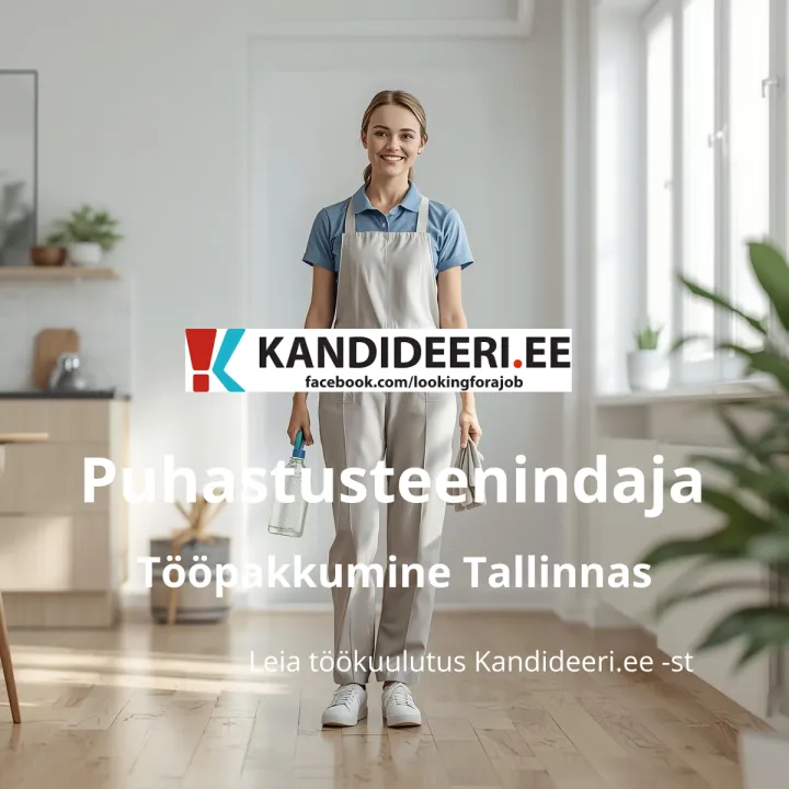 puhastusteenindaja töökoht Tallinnas koos väljaõppega kohapeal, väljaõpe tööandja poolt, koristus ja puhastus tööpakkumine, puhastusteenindaja tööpakkumine Tallinnas, vajalikd Eesti keele oskus vähemalt algtasemel, töötasu vastavalt töötundide arvule ja töö kvaliteedile ning kliendisuhtlusele