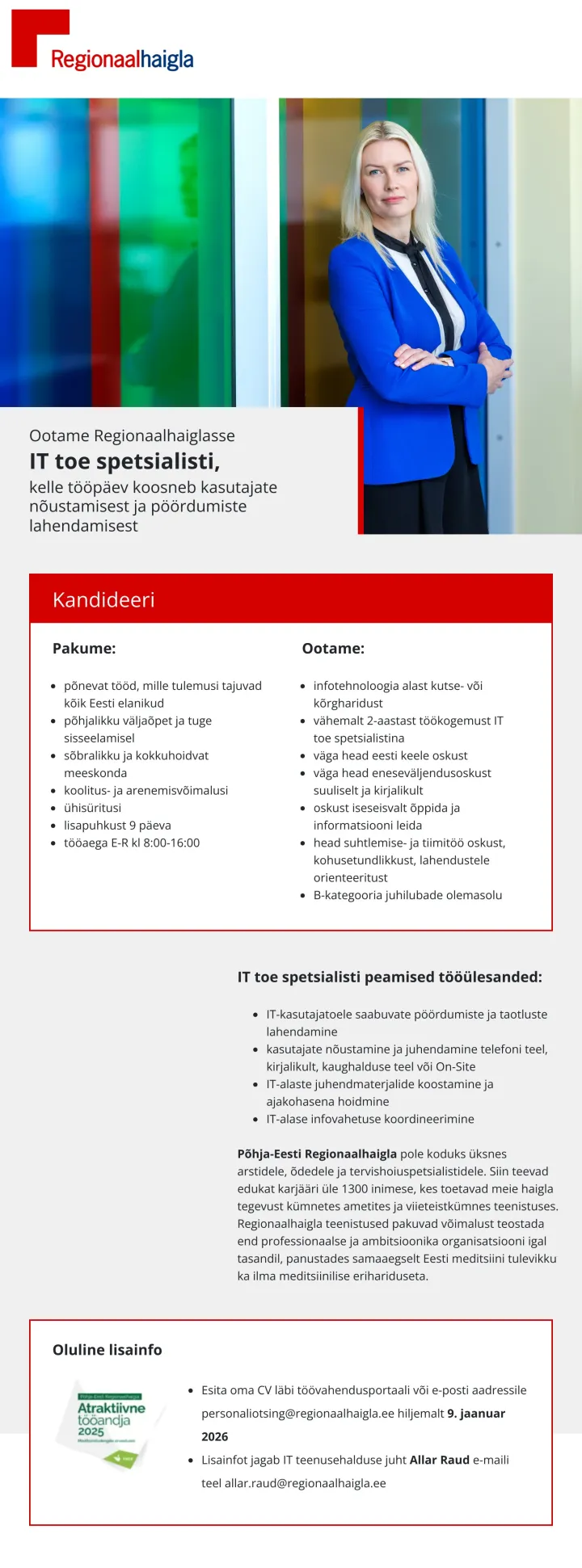 Regionaalhaigla on Eesti tipphaigla, mille põhiväärtused on pühendumine ja professionaalsus, hoolivus ja vastutustundlikkus, avatus ja koostöövalmidus. Oleme Eesti juhtiv tervishoiuasutus ja tervishoiusektori innovatsiooni eestvedaja, kes vastutab Põhja-Eesti ja saarte elanike meditsiinilise turvalisuse eest. Regionaalhaigla grupis töötab patsientide heaks ligi 5000 inimest – meie meeskonda kuuluvad arstid, õed, hooldajad ja muude erialade spetsialistid. Arste on meil üle 500, lisaks praktiseerib Regionaalhaiglas pidevalt ka enam kui sada arsti-residenti.