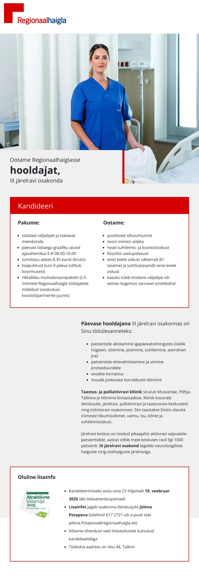 Regionaalhaigla on Eesti tipphaigla, mille põhiväärtused on pühendumine ja professionaalsus, hoolivus ja vastutustundlikkus, avatus ja koostöövalmidus. Oleme Eesti juhtiv tervishoiuasutus ja tervishoiusektori innovatsiooni eestvedaja, kes vastutab Põhja-Eesti ja saarte elanike meditsiinilise turvalisuse eest. Regionaalhaigla grupis töötab patsientide heaks ligi 5000 inimest – meie meeskonda kuuluvad arstid, õed, hooldajad ja muude erialade spetsialistid. Arste on meil üle 500, lisaks praktiseerib Regionaalhaiglas pidevalt ka enam kui sada arsti-residenti.
