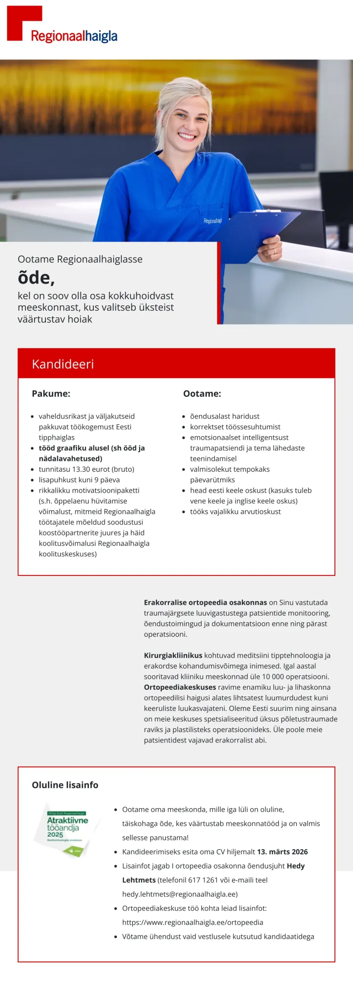 Regionaalhaigla on Eesti tipphaigla, mille põhiväärtused on pühendumine ja professionaalsus, hoolivus ja vastutustundlikkus, avatus ja koostöövalmidus. Oleme Eesti juhtiv tervishoiuasutus ja tervishoiusektori innovatsiooni eestvedaja, kes vastutab Põhja-Eesti ja saarte elanike meditsiinilise turvalisuse eest. Regionaalhaigla grupis töötab patsientide heaks ligi 5000 inimest – meie meeskonda kuuluvad arstid, õed, hooldajad ja muude erialade spetsialistid. Arste on meil üle 500, lisaks praktiseerib Regionaalhaiglas pidevalt ka enam kui sada arsti-residenti.