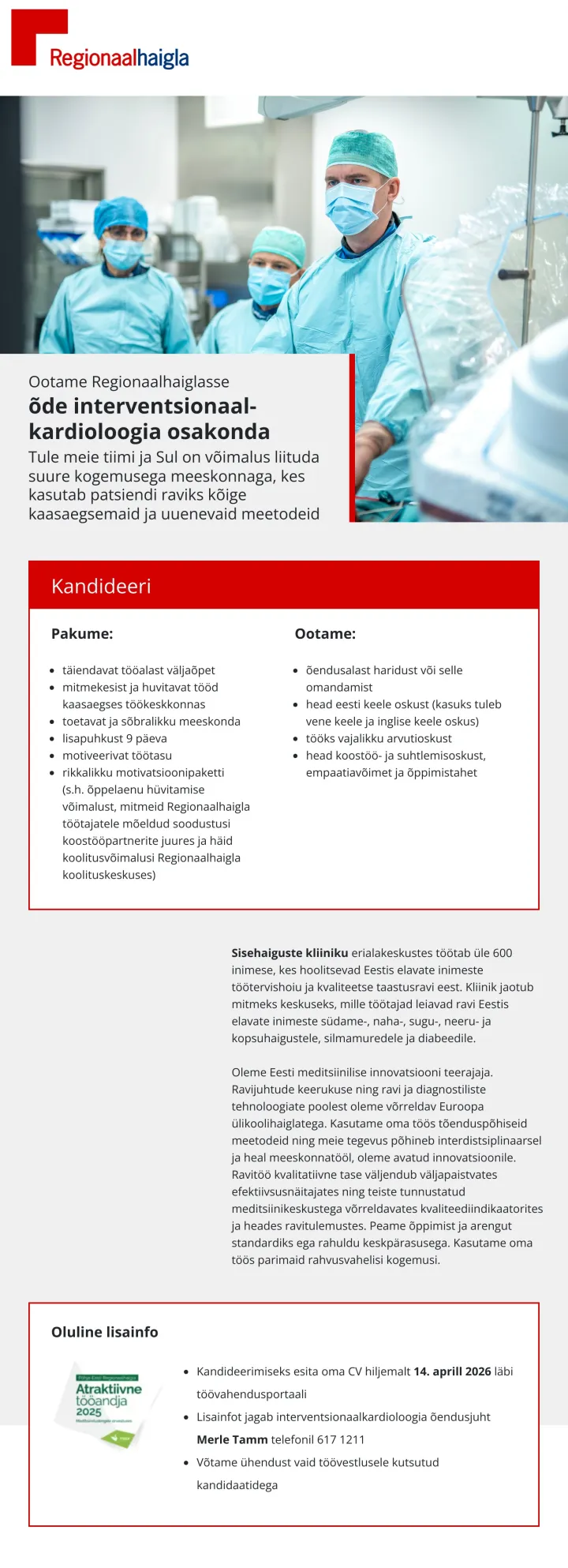 Regionaalhaigla on Eesti tipphaigla, mille põhiväärtused on pühendumine ja professionaalsus, hoolivus ja vastutustundlikkus, avatus ja koostöövalmidus. Oleme Eesti juhtiv tervishoiuasutus ja tervishoiusektori innovatsiooni eestvedaja, kes vastutab Põhja-Eesti ja saarte elanike meditsiinilise turvalisuse eest. Regionaalhaigla grupis töötab patsientide heaks ligi 5000 inimest – meie meeskonda kuuluvad arstid, õed, hooldajad ja muude erialade spetsialistid. Arste on meil üle 500, lisaks praktiseerib Regionaalhaiglas pidevalt ka enam kui sada arsti-residenti.