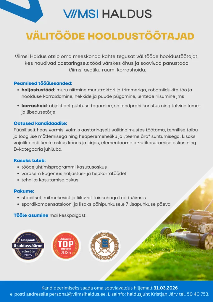 Kandideerimiseks saada oma sooviavaldus hiljemalt 31.03.2026 e-posti aadressile personal@viimsihaldus.ee. Lisainfo: haldusjuht Kristjan Järv tel. 50 40 753