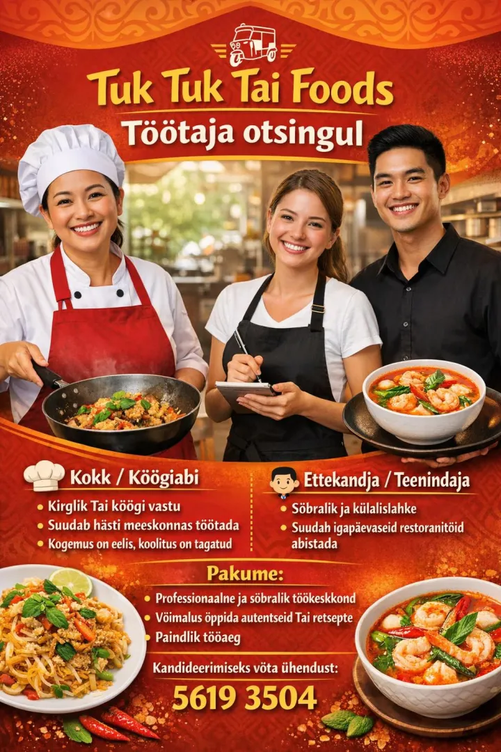 TukTuk Tai Foods restoran otsib enda meeskonda tublit teenindajat.Põhiline tööaeg on nädalavahetustel ja vahest soovi korral ka nädala sees.Palk 6-8€ tunnis Neto (Oleneb kogemusest).Omaltpoolt pakume tasuta toitlustust kogu päeva jooksul ja spordiga tegelemise võimalust.Kui sa arvad, et oled õige kandidaat võta meiega ühendust.56193504.