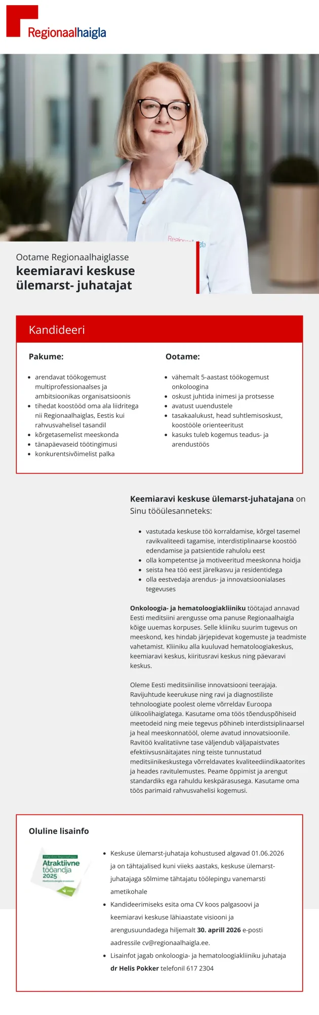 Regionaalhaigla on Eesti tipphaigla, mille põhiväärtused on pühendumine ja professionaalsus, hoolivus ja vastutustundlikkus, avatus ja koostöövalmidus. Oleme Eesti juhtiv tervishoiuasutus ja tervishoiusektori innovatsiooni eestvedaja, kes vastutab Põhja-Eesti ja saarte elanike meditsiinilise turvalisuse eest. Regionaalhaigla grupis töötab patsientide heaks ligi 5000 inimest – meie meeskonda kuuluvad arstid, õed, hooldajad ja muude erialade spetsialistid. Arste on meil üle 500, lisaks praktiseerib Regionaalhaiglas pidevalt ka enam kui sada arsti-residenti.