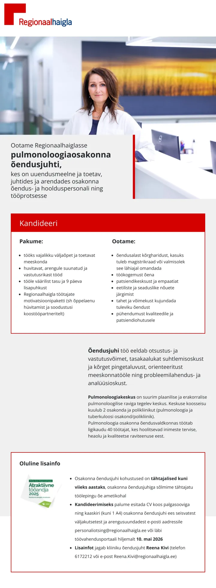 Regionaalhaigla on Eesti tipphaigla, mille põhiväärtused on pühendumine ja professionaalsus, hoolivus ja vastutustundlikkus, avatus ja koostöövalmidus. Oleme Eesti juhtiv tervishoiuasutus ja tervishoiusektori innovatsiooni eestvedaja, kes vastutab Põhja-Eesti ja saarte elanike meditsiinilise turvalisuse eest. Regionaalhaigla grupis töötab patsientide heaks ligi 5000 inimest – meie meeskonda kuuluvad arstid, õed, hooldajad ja muude erialade spetsialistid. Arste on meil üle 500, lisaks praktiseerib Regionaalhaiglas pidevalt ka enam kui sada arsti-residenti.