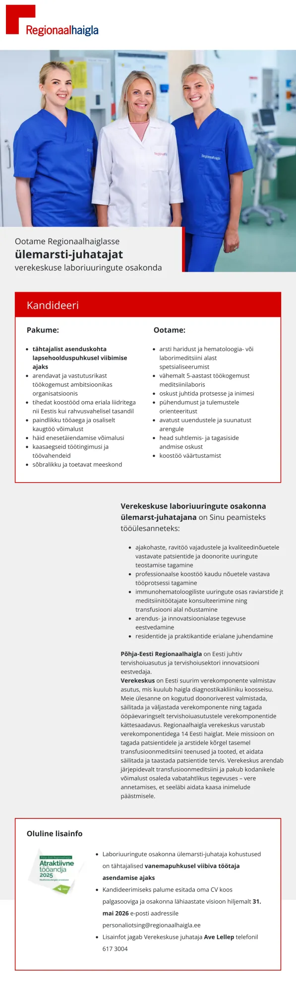 Regionaalhaigla on Eesti tipphaigla, mille põhiväärtused on pühendumine ja professionaalsus, hoolivus ja vastutustundlikkus, avatus ja koostöövalmidus. Oleme Eesti juhtiv tervishoiuasutus ja tervishoiusektori innovatsiooni eestvedaja, kes vastutab Põhja-Eesti ja saarte elanike meditsiinilise turvalisuse eest. Regionaalhaigla grupis töötab patsientide heaks ligi 5000 inimest – meie meeskonda kuuluvad arstid, õed, hooldajad ja muude erialade spetsialistid. Arste on meil üle 500, lisaks praktiseerib Regionaalhaiglas pidevalt ka enam kui sada arsti-residenti.
